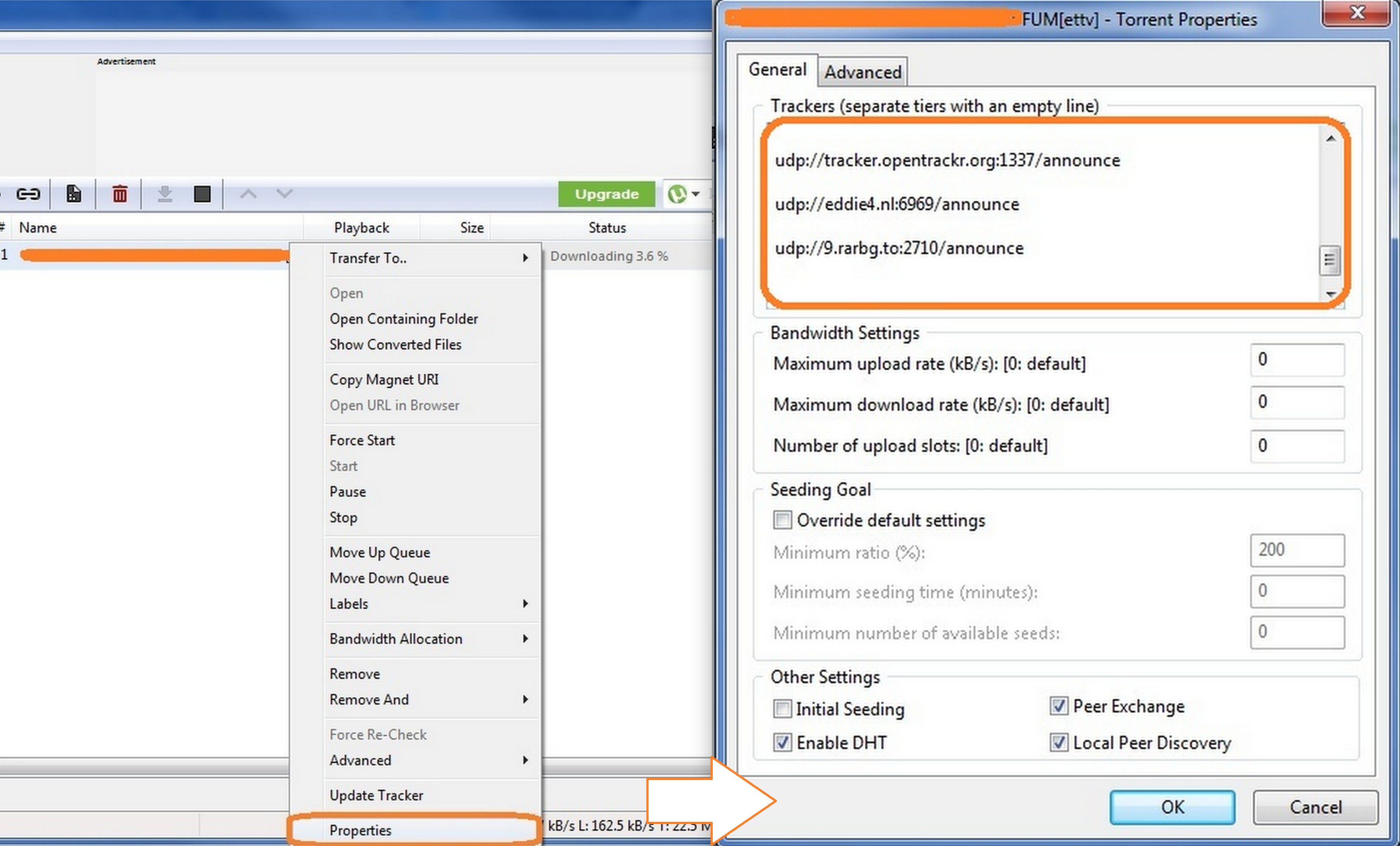 要添加新的跟蹤器,首先右鍵單擊您正在下載的 torrent,然后選擇屬性。常規選項卡下,您將找到跟蹤器列表。滾動到底部并從下面給出的列表中粘貼跟蹤器。