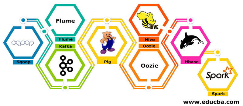 有幾個組件,如豬、蜂巢、sqoop、水槽、mahout、oozie、zookeeper、HBase等。